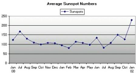 Ale nyní, jak běží rok 2002, je to tu zase. Slunce je znovu poseto skvrnami a erupce jsou časté. Zdá se, že solární cyklus má dva vrcholy. Druhý je právě tady.